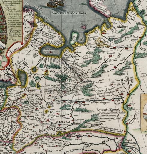 | Keywords: Willem Janszoon Blaeu. Tabula Russiae ex autographo, quod delineandum curavit Foedor filius Tzaris Borois desumta. MDCXIIII.G.jpg en Willem Janszoon Blaeu Tabula Russiae ex autographo quod delineandum curavit Foedor filius Tzaris Borois desumta ¦ MDCXIIII<br /> A gorgeous example of Hessel Gerritsz's map of Russia with the large inset of Moscow and plan of Archangelsckagoroda Hessel Gerritsz's map of Russia first issued 1613 was published by Blaeu after he acquired the plate following Gerritsz's death in 1632 The top left corner has an inset plan of Moscow with a 17-point key On the right is a prospect of Archangel Russia's only northern port until the founding of St Petersburg in 1700 Three figures in Russian dress stand above The title is within a martial cartouche The map was compiled from manuscript maps and work brought back by Isaac Massa The inset plan of Moscow has been attributed to the Crown Prince Fydor Gudonov Image Willem Janszoon Blaeu Tabula Russiae ex autographo quod delineandum curavit Foedor filius Tzaris Borois desumta MDCXIIII jpg https //www raremaps com/gallery/detail/23941/Tabula_Russiae_ex_autographo_quod_delineandum_curavit_Foedor_filius_Tzaris/Blaeu html www raremaps com ca 1635 Creator Willem Janszoon Blaeu PD-Art-100 Maps by Willem and Johannes Blaeu 1635 maps Old maps of Ukraine Old maps of Tsardom of Russia |