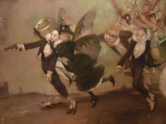 | Keywords: WILLETTE Adolphe,1884 - Parce Domine - Detail 004.jpg - Detail 004 - Au-dessus de la Seine à Paris une élégante Parisienne aux ailes de papillon emporte l'âme de Pierrot saisi par la mort loin de la foule dansante loin d'un Pierrot triste et d'un autre effaré - Above the Seine in Paris an elegant Parisian woman with butterfly wings takes the soul of the dead Pierrot away from the festive crowd and also far from others sad and appalled Pierrot - Montmartre - 1884 Oil on canvas Montmartre Own other versions PD-old-auto 1926 Details of Parce Domine by Adolphe Willette |