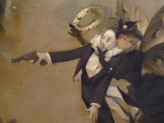 | Keywords: WILLETTE Adolphe,1884 - Parce Domine - Detail 006.jpg - Detail 006 - Au-dessus de la Seine à Paris une élégante Parisienne aux ailes de papillon emporte l'âme de Pierrot saisi par la mort - Above the Seine in Paris an elegant Parisian with butterfly wings takes away the soul of dead Pierrot - Montmartre - 1884 Oil on canvas Montmartre Own other versions PD-old-auto 1926 Details of Parce Domine by Adolphe Willette | ||||