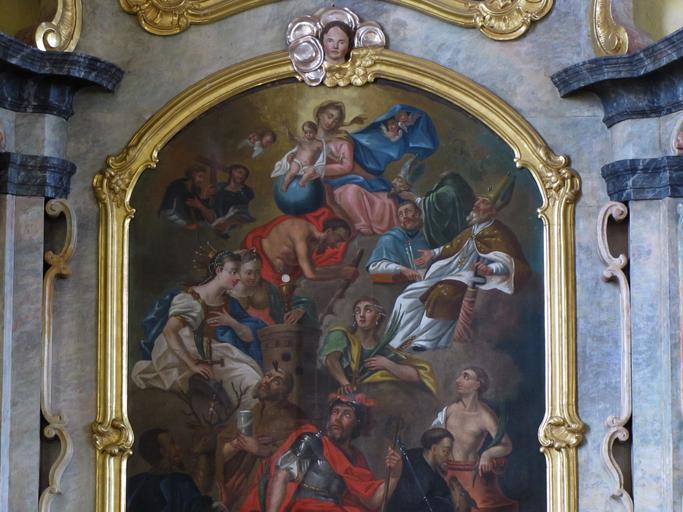 Keywords: Willgottheim StMaurice 40.JPG Alsace Bas-Rhin Willgottheim Eglise St Maurice Autel secondaire 1778 avec tableau de Sébastien Koch 14 intercesseurs 1776-1778 own 2012 Ralph Hammann Cc-zero Artwork / Œuvre d'art / Kunstwerk oil canvas cm 195 148 Eglise Saint-Maurice Willgottheim Autel secondaire PM67000448 IM67010045 object history Comme pour le maître-autel l'accord pour les tableaux des autels latéraux fut passé avec le peintre de Haguenau Sébastien Koch le 5 février 1776 Ils seront achevés en 1778 other versions Ralph Hammann PD-old-100 accession number Altar of Fourteen Holy Helpers of Église Saint-Maurice de Willgottheim Photographs of Willgottheim by Ralph Hammann Taken with Canon PowerShot SX20 IS Objets monuments historiques in Bas-Rhin church paintings Baroque church paintings in Alsace 18th-century church paintings in Alsace Paintings of Christian saints in France Fourteen Holy Helpers 1778 oil on canvas paintings in France 1778 works in Alsace |