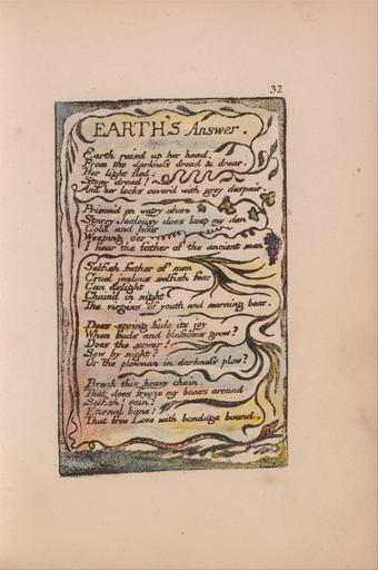 Keywords: William Blake - Songs of Innocence and of Experience, Plate 32, "Earth's Answer" (Bentley 31) - Google Art Project.jpg print brown pen ink black watercolor paper cream Relief etching printed in dark-brown with pen and black ink and watercolor on moderately thick slightly textured cream wove paper London 1757 London 1827 William male 2369124 Blake British 1757 - 1827 /collection/yale-center-for-british-art/artwork/songs-of-innocence-and-of-experience-plate-32-earths-answer-bentley-31-william-blake/2395010/ William Blake Artist /artist/william-blake/4130035/ 4130035 /collection/yale-center-for-british-art/ Yale Center for British Art 2305845 http //britishart yale edu/ 2/23/2012 9 52 13 PM /collection/yale-center-for-british-art/artwork/songs-of-innocence-and-of-experience-plate-32-earths-answer-bentley-31-william-blake/2395010/ 1789 1789 to 1794 branches leaf serpent snake fruit text vegetation vines historical subject Relief etching printed in dark-brown with pen and black ink and watercolor on moderately thick slightly textured cream wove paper 117 2395010 False 1794 3/25/2012 9 18 38 PM YCBA/lido-TMS-3753 http //collections britishart yale edu/vufind/Record/1667997 Yale Center for British Art Paul Mellon Collection print 1780 1800 Felpham Creation w73 x h117 cm 1789 to 1794 False 0 6640625 Volume songs-of-innocence-and-of-experience-plate-32-earths-answer-bentley-31-william-blake Songs of Innocence and of Experience Plate 32 Earth's Answer Bentley 31 s 73 Inscribed in black ink upper right 32 Inscription _Signed_and_Dated Not signed not dated Not on View Relief etching printed in dark-brown with pen and black ink and watercolor on moderately thick slightly textured cream wove paper branches leaf serpent snake fruit text vegetation vines historical subject special url_id HgHaRXT-SKUHGQ PD-old-100-1923 1827 Songs of Innocence and Experience - Copy L Google Art Project works by William Blake Songs of Experience - Earth's Answer |