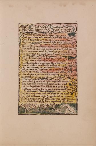 Keywords: William Blake - Songs of Innocence and of Experience, Plate 7, "The Chimney Sweeper" (Bentley 12) - Google Art Project.jpg print brown pen ink black watercolor paper cream Relief etching printed in dark-brown with pen and black ink and watercolor on moderately thick slightly textured cream wove paper London 1757 London 1827 William male 2369124 Blake British 1757 - 1827 /collection/yale-center-for-british-art/artwork/songs-of-innocence-and-of-experience-plate-7-the-chimney-sweeper-bentley-12-william-blake/2395041/ William Blake Artist /artist/william-blake/4130035/ 4130035 /collection/yale-center-for-british-art/ Yale Center for British Art 2305845 http //britishart yale edu/ 2/23/2012 9 52 54 PM /collection/yale-center-for-british-art/artwork/songs-of-innocence-and-of-experience-plate-7-the-chimney-sweeper-bentley-12-william-blake/2395041/ 1789 1789 to 1794 branches leaf children women text trees vine historical subject Relief etching printed in dark-brown with pen and black ink and watercolor on moderately thick slightly textured cream wove paper 114 2395041 False 1794 3/25/2012 6 32 05 PM YCBA/lido-TMS-3779 http //collections britishart yale edu/vufind/Record/1668025 Yale Center for British Art Paul Mellon Collection print 1780 1800 Felpham Creation w73 x h114 cm 1789 to 1794 False 0 658203125 Volume songs-of-innocence-and-of-experience-plate-7-the-chimney-sweeper-bentley-12-william-blake Songs of Innocence and of Experience Plate 7 The Chimney Sweeper Bentley 12 s 73 Inscribed in black ink upper right 7 Inscription _Signed_and_Dated Not signed not dated Not on View Relief etching printed in dark-brown with pen and black ink and watercolor on moderately thick slightly textured cream wove paper branches leaf children women text trees vine historical subject special url_id JAFFD36DLzc-OA PD-old-100-1923 1827 Songs of Innocence and Experience - Copy L Google Art Project works by William Blake |