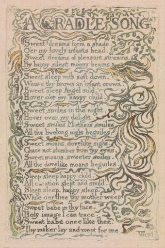 | Keywords: William Blake - Songs of Innocence and of Experience, Plate 26, "A Cradle Song" (Bentley 16) - Google Art Project.jpg print green pen ink watercolor paper cream Relief etching printed in green with pen and ink and watercolor on moderately thick slightly textured cream wove paper London 1757 London 1827 William male 2369124 Blake British 1757 - 1827 /collection/yale-center-for-british-art/artwork/songs-of-innocence-and-of-experience-plate-26-a-cradle-song-bentley-16-william-blake/2363522/ William Blake Artist /artist/william-blake/4130035/ 4130035 /collection/yale-center-for-british-art/ Yale Center for British Art 2305845 http //britishart yale edu/ 2/23/2012 9 37 15 PM /collection/yale-center-for-british-art/artwork/songs-of-innocence-and-of-experience-plate-26-a-cradle-song-bentley-16-william-blake/2363522/ 1789 1789 branches sleeping mother women children infant baby woman leaf text vines chair cradle crib drapes historical subject Relief etching printed in green with pen and ink and watercolor on moderately thick slightly textured cream wove paper 114 2363522 False 1789 3/24/2012 2 22 26 PM YCBA/lido-TMS-2505 http //collections britishart yale edu/vufind/Record/1667376 Yale Center for British Art Paul Mellon Collection print 1780 1790 Felpham Creation w73 x h114 cm 1789 False 0 6640625 Volume songs-of-innocence-and-of-experience-plate-26-a-cradle-song-bentley-16-william-blake Songs of Innocence and of Experience Plate 26 A Cradle Song Bentley 16 s 73 Inscribed in graphite upper center 15 Inscription _Signed_and_Dated Not signed not dated Not on View Relief etching printed in green with pen and ink and watercolor on moderately thick slightly textured cream wove paper branches sleeping mother women children infant baby woman leaf text vines chair cradle crib drapes historical subject special url_id 5QEE_vJoykWyfA PD-old-100-1923 1827 Songs of Innocence and Experience - Copy F Google Art Project works by William Blake |