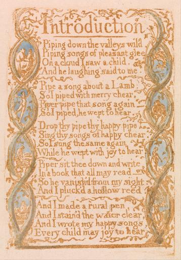 Keywords: William Blake - Songs of Innocence, Plate 3, "Introduction" (Bentley 4) - Google Art Project.jpg print brown watercolor paper cream Relief etching printed in brown with watercolor on moderately thick slightly textured cream wove paper London 1757 London 1827 William male 2369124 Blake British 1757 - 1827 /collection/yale-center-for-british-art/artwork/songs-of-innocence-plate-3-introduction-bentley-4-william-blake/2372967/ William Blake Artist /artist/william-blake/4130035/ 4130035 /collection/yale-center-for-british-art/ Yale Center for British Art 2305845 http //britishart yale edu/ 2/23/2012 9 51 27 PM /collection/yale-center-for-british-art/artwork/songs-of-innocence-plate-3-introduction-bentley-4-william-blake/2372967/ 1789 1789 branches leaf woman text trees vine historical subject Relief etching printed in brown with watercolor on moderately thick slightly textured cream wove paper 117 2372967 False 1789 3/24/2012 3 14 22 PM YCBA/lido-TMS-3717 http //collections britishart yale edu/vufind/Record/1667964 Yale Center for British Art Paul Mellon Collection print 1780 1790 London Creation w79 x h117 cm 1789 False 0 69921875 Volume songs-of-innocence-plate-3-introduction-bentley-4-william-blake Songs of Innocence Plate 3 Introduction Bentley 4 s 79 No inscription Inscription _Signed_and_Dated Not signed not dated Not on View Relief etching printed in brown with watercolor on moderately thick slightly textured cream wove paper branches leaf woman text trees vine historical subject special url_id MQHhXJmSDkMMSw PD-old-100-1923 1827 Songs of Innocence - Introduction Google Art Project works by William Blake Songs of Innocence - Copy G 1789 |