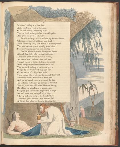 | Keywords: William Blake - Young's Night Thoughts, Page 37, "Love, and love only, is the loan for love" - Google Art Project.jpg ~ 1797 etching line engraving watercolor paper cream Etching and line engraving with watercolor on moderately thick slightly textured cream wove paper London 1757 London 1827 William male 2369124 Blake British 1757 - 1827 /collection/yale-center-for-british-art/artwork/youngs-night-thoughts-page-37-love-and-love-only-is-the-loan-for-love-william-blake/2358651/ William Blake Artist /artist/william-blake/4130035/ 4130035 /collection/yale-center-for-british-art/ Yale Center for British Art 2305845 http //britishart yale edu/ 2/23/2012 9 34 52 PM /collection/yale-center-for-british-art/artwork/youngs-night-thoughts-page-37-love-and-love-only-is-the-loan-for-love-william-blake/2358651/ 1792 ca 1797 leaf palm trees horses animals men grass text trees goblets cups serpents historical subject Etching and line engraving with watercolor on moderately thick slightly textured cream wove paper 425 2358651 False 1802 3/24/2012 1 55 12 PM YCBA/lido-TMS-2322 http //collections britishart yale edu/vufind/Record/1667275 Yale Center for British Art Paul Mellon Collection print 1790 1810 Felpham Creation w321 x h425 cm ca 1797 False 0 8203125 Volume youngs-night-thoughts-page-37-love-and-love-only-is-the-loan-for-love-william-blake Young's Night Thoughts Page 37 Love and love only is the loan for love y 321 No inscription Inscription _Signed_and_Dated Not signed not dated Not on View Etching and line engraving with watercolor on moderately thick slightly textured cream wove paper leaf palm trees horses animals men grass text trees goblets cups serpents historical subject special url_id ZQFadoU0jT0KIQ PD-old-100-1923 1827 William Blake's illustrations to Young's Night Thoughts Google Art Project works by William Blake |