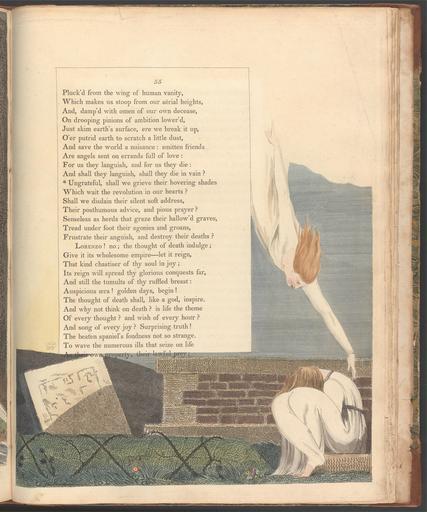 | Keywords: William Blake - Young's Night Thoughts, Page 55, "Ungrateful, shall we grieve their hovering shades" - Google Art Project.jpg ~ 1797 etching line engraving watercolor paper cream Etching and line engraving with watercolor on moderately thick slightly textured cream wove paper London 1757 London 1827 William male 2369124 Blake British 1757 - 1827 /collection/yale-center-for-british-art/artwork/youngs-night-thoughts-page-55-ungrateful-shall-we-grieve-their-hovering-shades-william-blake/2362566/ William Blake Artist /artist/william-blake/4130035/ 4130035 /collection/yale-center-for-british-art/ Yale Center for British Art 2305845 http //britishart yale edu/ 2/23/2012 9 35 02 PM /collection/yale-center-for-british-art/artwork/youngs-night-thoughts-page-55-ungrateful-shall-we-grieve-their-hovering-shades-william-blake/2362566/ 1792 ca 1797 women angel pointing thorns grass text grave flowers vines tombstone gravestone historical subject mourning Etching and line engraving with watercolor on moderately thick slightly textured cream wove paper 425 2362566 False 1802 3/24/2012 2 16 07 PM YCBA/lido-TMS-2329 http //collections britishart yale edu/vufind/Record/1667282 Yale Center for British Art Paul Mellon Collection print 1790 1810 London Creation w324 x h425 cm ca 1797 False 0 833984375 Volume youngs-night-thoughts-page-55-ungrateful-shall-we-grieve-their-hovering-shades-william-blake Young's Night Thoughts Page 55 Ungrateful shall we grieve their hovering shades y 324 No inscription Inscription _Signed_and_Dated Not signed not dated Not on View Etching and line engraving with watercolor on moderately thick slightly textured cream wove paper women angel pointing thorns grass text grave flowers vines tombstone gravestone historical subject mourning special url_id UgHY-HTo07iCQA PD-old-100-1923 1827 William Blake's illustrations to Young's Night Thoughts Google Art Project works by William Blake |