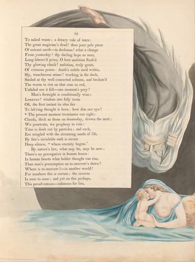 | Keywords: William Blake - Young's Night Thoughts, Page 13, "The Present Moment Terminates our Sight" - Google Art Project.jpg etching line engraving watercolor paper cream Etching and line engraving with watercolor on moderately thick slightly textured cream wove paper London 1757 London 1827 William male 2369124 Blake British 1757 - 1827 /collection/yale-center-for-british-art/artwork/youngs-night-thoughts-page-13-the-present-moment-terminates-our-sight-william-blake/2367992/ William Blake Artist /artist/william-blake/4130035/ 4130035 /collection/yale-center-for-british-art/ Yale Center for British Art 2305845 http //britishart yale edu/ 2/23/2012 9 49 24 PM /collection/yale-center-for-british-art/artwork/youngs-night-thoughts-page-13-the-present-moment-terminates-our-sight-william-blake/2367992/ 1797 1797 beard women kissing children men text bed pillow spear nudes historical subject Etching and line engraving with watercolor on moderately thick slightly textured cream wove paper 445 2367992 False 1797 3/24/2012 2 44 42 PM YCBA/lido-TMS-3576 http //collections britishart yale edu/vufind/Record/1667871 Yale Center for British Art Paul Mellon Collection print 1790 1800 Felpham Creation w327 x h445 cm 1797 False 0 74609375 Volume youngs-night-thoughts-page-13-the-present-moment-terminates-our-sight-william-blake Young's Night Thoughts Page 13 The Present Moment Terminates our Sight y 327 No inscription Inscription _Signed_and_Dated Not signed not dated Not on View Etching and line engraving with watercolor on moderately thick slightly textured cream wove paper beard women kissing children men text bed pillow spear nudes historical subject special url_id qAGuNT-EofGbpw PD-old-100-1923 1827 William Blake's illustrations to Young's Night Thoughts 013 Google Art Project works by William Blake |