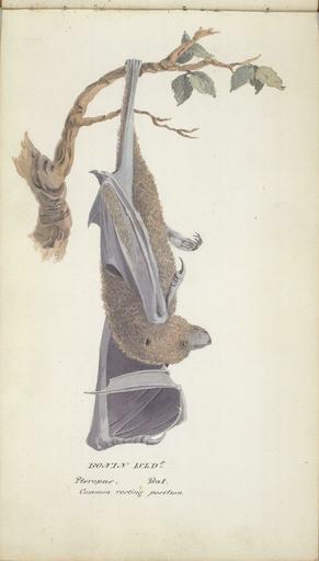 Keywords: William Smyth pteropus.jpg Bonin Islands Pteropus bat common resting position Drawing on paper watercolor Dimensions 13 7 x 23 7 cm UC Berkeley Bancroft Library<br> Object ID BANC PIC 1963 002 1303 20--AL B <br> Downloaded from http //lunaweb giza tulane edu/luna/servlet/detail/MOAC~100~1~68314~46746 Bonin-Isl-an-ds -Pteropus -bat -com circa 1825 1827 William Smyth 1800-1877 PD-100 William Smyth 1800-1877 Pteropus pselaphon |
