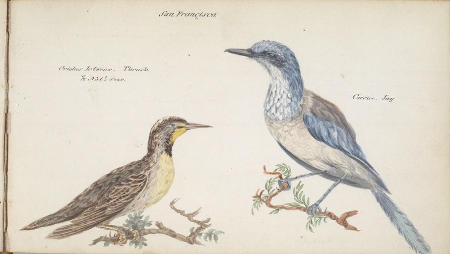 Keywords: William Smyth thrush and jay.jpg en San Francisco Oriolus Icterus Thrush 1/2 natural size Sturnella neglecta and Carrus Jay Aphelocoma californica birds California Drawing on paper watercolor Dimensions 13 7 x 23 7 cm UC Berkeley Bancroft Library<br> Object ID BANC PIC 1963 002 1303 14--AL B <br> Downloaded from http //lunaweb giza tulane edu/luna/servlet/detail/MOAC~100~1~105440~46740 San-Francisco -Oriolus-Icterus -Thr circa 1825 1827 William Smyth 1800-1877 PD-100 William Smyth 1800-1877 Sturnella neglecta Aphelocoma californica |