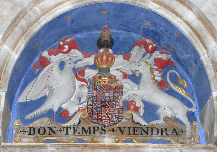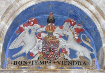 Keywords: WilliamBourchier 3rdEarlOfBath Achievement TawstockChurch.JPG heraldic achievement of William Bourchier 3rd Earl of Bath 1557-1623 detail from his monument in Tawstock Church Devon The escutcheon shows 53 quarterings with supporters dexter a falcon argent beaked and membered or the wings elevated vulned gules; sinister an heraldic tiger argent <ref>Supporters as surviving in stained glass window in cloister of Hengrave Hall Suffolk of arms of John Bourchier 2nd Earl of Bath as blazoned by Rokewood John Gage The History and Antiquities of Suffolk Thingoe Hundred pp 218-19http //books google co uk/books id knVPAAAAYAAJ pg PA227-IA2 lpg PA227-IA2 dq bourchier+supporters+tiger source bl ots -1SP39lvlC sig 5UTRws16ShDSYq4w-oHbW-Rrkow hl en sa X ei cz-CU-qYHsKL7AbVhYHoCg ved 0CDMQ6AEwAQ v onepage q bourchier 20supporters 20tiger f false</ref> Above is the crest of Bourchier A man's head in profile proper ducally crowned or with a pointed cap gules; below the motto of Bourchier Bon Temps Viendra the right time will come Quarters <br> 1 Bourchier<br> 2 Royal arms<br> 3 Bohun<br> 4 Brewer<br> 11 Brewer<br> 19 Grenville<br> 23 Louvain<br> 28 Hankford<br> 29 Stapledon<br> 40 Cogan<br> own photo 2013 Lobsterthermidor <span class signature-talk ></span> 20 08 25 May 2014 UTC St Peter's Church Tawstock interior Church monuments in Devon Heraldic memorials in the United Kingdom Reliefs of coats of arms in England Bourchier arms Hankford arms Stapledon arms Cogan arms Brewer arms Louvain arms Bohun arms Grenville of Westcountry arms Earls of Bath |