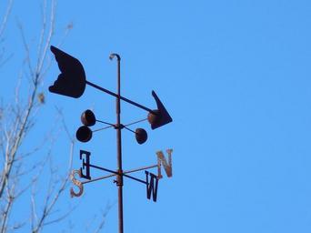 Keywords: wind weathervane weather vane direction metal arrow sky north south east west pointing roof climate day outdoor old silhouette forecast environment metallic daylight exterior symbol rotate spinning sign turning blue