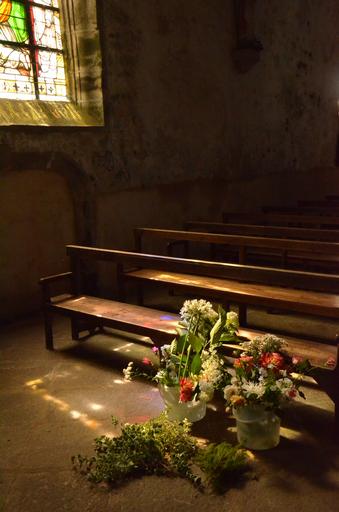 Keywords: window church church window sun sunlight stained glass bouquet flowers pew faith religion