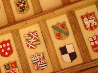 | Keywords: WindsorStGeorgeHallAlmadaCoatOfArms.jpg Coats of arms of Knights of the Garter on the ceiling of St George's Hall Windsor Castle Top left Albert V of Austria; 142 Lord Scales; 152 Richard Neville Earl of Salisbury; 162 Alvaro d'Almada Count of Avranches; 172 presumably Sir Edward Hull Paly Gules and Or a lion statant guardant Argent ; 141 John Talbot Earl of Shrewsbury; 151 Sir John Grey; 161 Sir Thomas Hoo; 171 Lord Bourchier Own 2005-04-11 Aalmada Public domain Knights of the Garter 15th century Coats of arms of English nobility Coats of arms of Austrian nobility Order of the Garter in heraldry Coats of arms of Almadas Interior of Windsor Castle Paintings of coats of arms |
