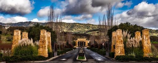 Keywords: winery napa valley california vineyard agriculture tourism mountains entrance gate pillars rural clouds scenic outdoor hdr panorama