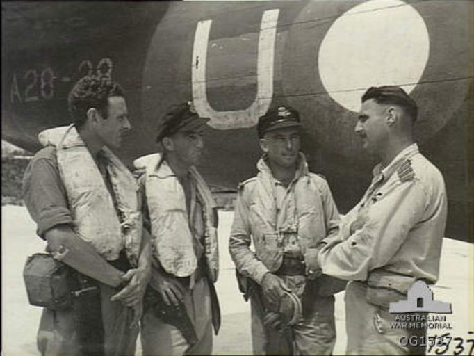 Keywords: Wing Commander Hickey with 22 Squadron RAAF Boston pilots New Guinea 1944 AWM OG1537.jpg AWM caption NOEMFOOR ISLAND DUTCH NEW GUINEA C 1944-08 COMMANDING OFFICER OF NO 22 BOSTON SQUADRON RAAF WING COMMANDER J HICKEY TOOWOOMBA QLD RIGHT WITH PILOTS OF THE SQUADRON BESIDE AIRCRAFT SERIAL NO A28-28 BEFORE SETTING OUT ON A STRIKE OVER ENEMY BASES WEARING THEIR LIFE JACKETS<br> LEFT TO RIGHT 413972 WARRANT OFFICER A C DOBSON RANDWICK NSW 406576 FLYING OFFICER FO F O'LEARY WEMBLEY WA 406996 FO F FORD BROOKTON WA OG1537 circa August 1944 Harrison John Thomas Copyright expired - public domain PD-AustraliaGov World War II people of the Royal Australian Air Force World War II forces of Australia in New Guinea No 22 Squadron RAAF Douglas Boston/A-20 Havoc aircrew Douglas Boston in Australian service ImageNote 1 334 79 66 82 450 338 2 COMMANDING OFFICER OF NO 22 BOSTON SQUADRON RAAF WING COMMANDER J HICKEY TOOWOOMBA QLD ImageNoteEnd 1 ImageNote 2 61 65 73 90 450 338 2 413972 WARRANT OFFICER A C DOBSON RANDWICK NSW ImageNoteEnd 2 ImageNote 3 145 89 58 82 450 338 2 406576 FLYING OFFICER FO F O'LEARY WEMBLEY WA ImageNoteEnd 3 ImageNote 4 236 92 61 87 450 338 2 406996 FO F FORD BROOKTON WA ImageNoteEnd 4 John Thomas Harrison |