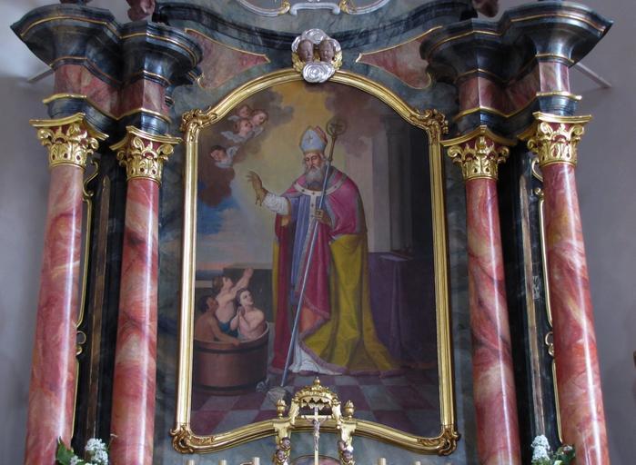 | Keywords: Wingersheim StNicolas 16.JPG Alsace Bas-Rhin Wingersheim Eglise Saint-Nicolas Maître-autel-tabernacle avec tableau Saint-Nicolas ressuscitant trois enfants XIXe own 2012 Ralph Hammann Cc-zero Artwork / Œuvre d'art / Kunstwerk Artist Saint Nicolas en costume d'évêque bénit les trois enfants assis dans le saloir ; au sol une bourse sur une table en arrière-plan un livre sur lequel sont posées trois petites bourses XIXe siècle oil canvas cm Eglise Saint-Nicolas Wingersheim IM67013164 object history other versions Ralph Hammann PD-old accession number Autel principal Église Saint-Nicolas de Wingersheim Photographs of Wingersheim by Ralph Hammann Taken with Canon PowerShot SX20 IS Objets monuments historiques in Bas-Rhin church paintings Baroque church paintings in Alsace 18th-century church paintings in Alsace Paintings of Saint Nicholas Paintings of putti in France 18th-century paintings of putti Saint Nicholas and the three children |