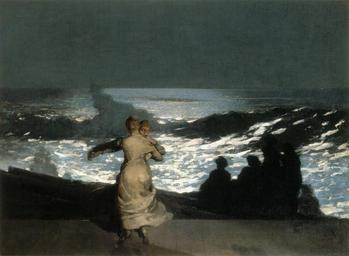 Keywords: Winslow Homer - Summer Night (1890).jpg Artwork Q17494534 Creator Winslow Homer 1890 oil canvas cm 76 7 102 institution Musée d'Orsay 000PE021223 http //www musee-orsay fr/index php id 851 L 1 tx_commentaire_pi1 5BshowUid 5D 455 no_cache 1 Musée d'Orsay online object history Date acquisition 1900 credit line Homer 1890 ~ lower left signature and date This nocturnal scene by the sea transcends observed reality through a keen sense of poetry and mystery The light and shade effects blur shapes while the ghostly silhouettes of two women dance on the shore Although it may well have been influenced by Courbet's Waves the lyricism tinged with mysticism expressed by Homer helped develop a feeling for nature that is peculiarly American accession number RF 1977 427 1 source <br/>2 8556 PD-old-100-1923 DEFAULTSORT Homer Summer night 1890; Musée d'Orsay Oil paintings by Winslow Homer 1890s paintings by Winslow Homer 1890 Summer night Musée d'Orsay Paintings in Musée d'Orsay Paintings of dancing couples 1890 oil on canvas paintings in France |