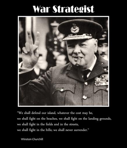 Keywords: war strategist warstrategist politics politician victory vintage quotation words text winston churchill winstonchurchill britain wwii people poster "We shall defend our island, whatever the cost may be, we shall fight on the beaches, we shall fight on the landing grounds, we shall fight in the fields and in the streets, we shall fight in the hills; we shall never surrender." Winston Churchill Secrets of Leadership: Churchill Dr Alan Brown Published on Nov 14, 2014 youtu.be/FipWwE4ZjBU This BBC film from 2002 is by Dr Andrew Roberts, and it offers a personal analysis of the skills and strategies used by Winston Churchill to win support both from the military and the general population. Uploaded for educational purposes only. Any advertisements are unbidden by me. Comments are welcome if they fully engage with the film's arguments. "We shall defend our island, whatever the cost may be, we shall fight on the beaches, we shall fight on the landing grounds, we shall fight in the fields and in the streets, we shall fight in the hills; we shall never surrender." Winston Churchill Secrets of Leadership: Churchill Dr Alan Brown Published on Nov 14, 2014 youtu.be/FipWwE4ZjBU This BBC film from 2002 is by Dr Andrew Roberts, and it offers a personal analysis of the skills and strategies used by Winston Churchill to win support both from the military and the general population. Uploaded for educational purposes only. Any advertisements are unbidden by me. Comments are welcome if they fully engage with the film's arguments. |