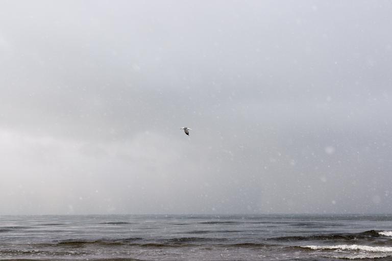 Keywords: latvia jurmala baltic sea balticsea gulf of riga gulfofriga bay seaside beach winter snow snowing water waves gull seagull seabird bird shore coast outdoor Jurmala beach in winter Jurmala beach in winter