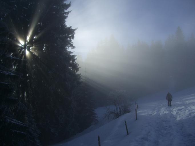 Keywords: winter fog firs sunbeam light snow wanderer snow lane winter hike allgäu