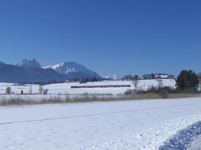 Keywords: winter magic mountain panorama snow railway train sky blue lake allgäu winter