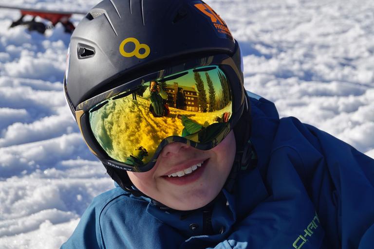 Keywords: winter mountains snow glasses reflection ski goggles helmet smile boy