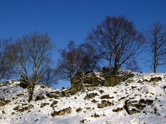 Keywords: winter snow rocks trees hill moor warren hills blue sky cold ice day daytime sun sunny