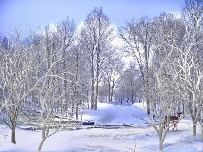 Keywords: winter snow roe deer animal cold sky clouds tree away