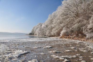 Keywords: winter water frost cold blue sky sun white outdoor river frozen