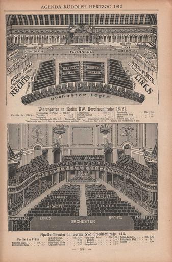 Keywords: Wintergarten in Berlin NW, Dorotheenstraße 18-21 und Apollo-Theater in Berlin SW, Friedrichstraße 128, Bestuhlung 1912.jpg Rudolph Hertzog Agenda 1912 Jahreskalender des Berliner Kaufhauses Seite 109 Wintergarten in Berlin NW Dorotheenstraße 18-21 und Apollo-Theater in Berlin SW Friedrichstraße 128 Leinen 224 Seiten 19 5 x 28 5 cm Collection Kuhn 1912 publication date author PD-old <gallery> File Wintergarten in Berlin NW Dorotheenstraße 18-21 Bestuhlung 1912 jpg File Apollo-Theater in Berlin SW Friedrichstraße 128 Bestuhlung 1912 jpg </gallery> Rudolph Hertzog Agenda 1912 109 Wintergarten Varieté Apollo-Theater Berlin |