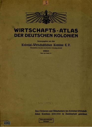 Keywords: Wirtschafts-Atlas der deutschen Kolonien - 01.jpg Wirtschafts-Atlas der deutschen Kolonien - jpg 02 Wirtschaftsatlas der Deutschen Kolonien Wirtschafts-Atlas der deutschen Kolonien Kolonialwirtschaftliches Komitee Hrsg Berlin 1906 Lithographie und Druck durch D Reimer E Vöhsen AG Berlin<br/>Online Göttinger Digitalisierungszentrum http //resolver sub uni-goettingen de/purl PPN574238239 PPN574238239 1906 Edited by Paul Sprigade 1863-1928 Max Moisel 1869-1920 PD-old Wirtschafts-Atlas der deutschen Kolonien 1906 book covers |