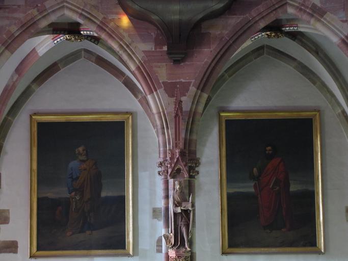 Keywords: Wissembourg StPierre-Paul26.JPG fr Alsace Bas-Rhin Wissembourg Eglise abbatiale Saints-Pierre et Paul Peintures de Saint-Pierre et Saint-Paul 1843-1844 own Rh-67 2010 cc-by-sa-3 0 IM67011559 Artwork / Œuvre d'art / Kunstwerk oil canvas 260 cm de large Abbatiale Saints-Pierre et Paul Wissembourg IM67012074 object history Deux tableaux représentant l'un saint Pierre et l'autre saint Paul furent demandés à la direction des Beaux-Arts du Ministère de l'intérieur pour la décoration de l'église en 1843 par l'intermédiaire du député du Bas-Rhin Max Théodore Cerfberr Ce souhait fut accueilli favorablement et les tableaux furent exécutés aux frais du gouvernement par le peintre Pierre André Victor Félix Cassel qui avait fait l'objet de recommandations particulières à l'occasion de la demande En novembre 1843 Cerfber demanda au curé Paulus des renseignements dimensions nécessaires à l'artiste pour l'exécution et lui joignit deux esquisses pour avis A D 67 2 G 544 /B103 esquisses non conservées ce qui situerait la mise en oeuvre au plus tôt à la fin 1843 puis sans doute en 1844 other versions Ralph Hammann PD-old accession number Nave of Sts Peter and Paul Church Wissembourg Church paintings in Bas-Rhin Photographs of Wissembourg by Ralph Hammann Neoclassical church paintings in Alsace 19th-century church paintings in Alsace 19th-century paintings of Saint Peter Paintings of Saint Peter in France Paintings of Saint Paul Gothic revival statues in Bas-Rhin Sandstone statues in Bas-Rhin Dagobert I 19th-century statues in Alsace |