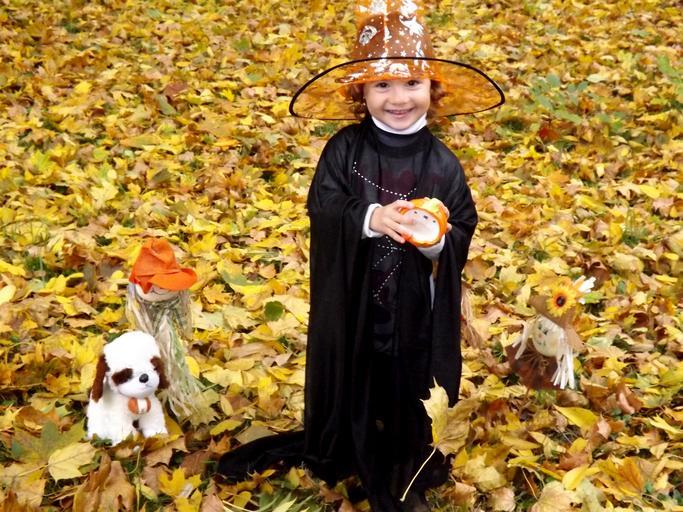 Keywords: witch halloween child girl autumn leaves hats cloak spell