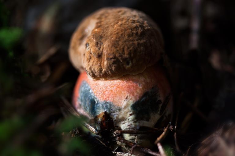 Keywords: witches placidus young frisch mushroom schusterpilz thunder sponge boletus erythropus hat arched dark brown stalk thick red yellow blue edible moss green macro close