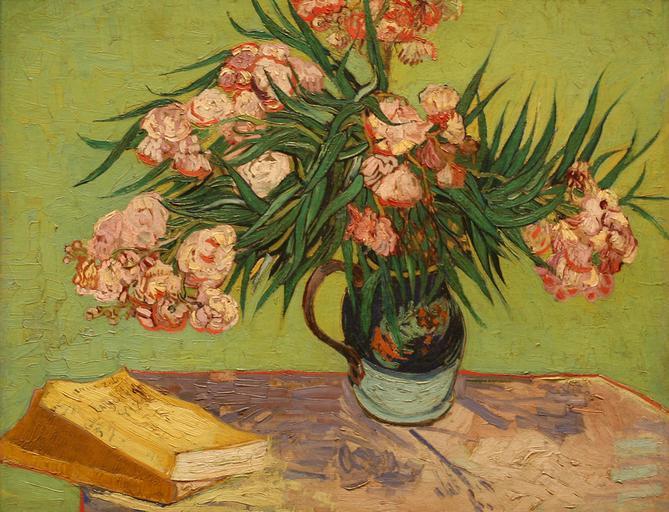 | Keywords: WLA metmuseum Oleanders by Vincent van Gogh.jpg  Artwork Creator Vincent van Gogh Still Life Vase with Oleanders and Books Oil on canvas cm 60 3 73 6 NYC 62 24 Van Gogh catalogues 593 1566 met Painted at Arles; Provenance provenanceEvent gift Mr and Mrs John L Loeb 1962 Wikipedia Loves Art participant http //www flickr com/groups/wikipedia_loves_art/pool/tags/shooting_brooklyn/ shooting_brooklyn Uploaded from the http //www flickr com/groups/wikipedia_loves_art/pool/ Wikipedia Loves Art photo pool on Flickr 1888-08 Other versions <gallery> File Oleanders - 1888 jpg File Van Gogh - Vase mit Oleander und Bücher jpeg </gallery> WLA metmuseum 62 24 shooting_brooklyn shooting brooklyn 28314321 N06 3310824644 Vincent van Gogh Dutch 1853 “1890 <br /> Oleanders 1888<br /> Oil on canvas; 23 3/4 x 29 in 60 3 x 73 7 cm <br /> The Metropolitan Museum of Art New York Gift of Mr and Mrs John L Loeb 1962 62 24 <br /> <br /> http //www metmuseum org/works_of_art/collection_database/european_paintings/oleanders_vincent_van_gogh/objectview aspx collID 11 OID 110000972 View at the Metropolitan Museum of Art website PD-old-100 cc-by-sa-2 5 Still Life Vase with Oleanders and Books |