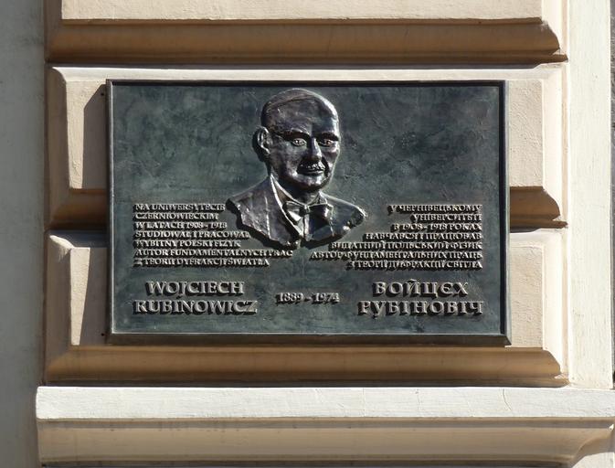 Keywords: Wojciech Rubinowicz Czerniowce.jpg pl Tablica pamiątkowa na budynku Uniwersytetu w Czerniowcach own Szczebrzeszynski 2012-09-10 Wojciech Rubinowicz