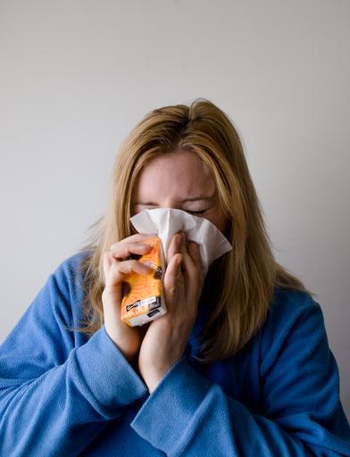 Keywords: woman blow blowing nose hand chief grey blond female model person people face ill allergy hospital disease white medicine sick flu protection virus sickness winter antiviral patient illness healthcare blue