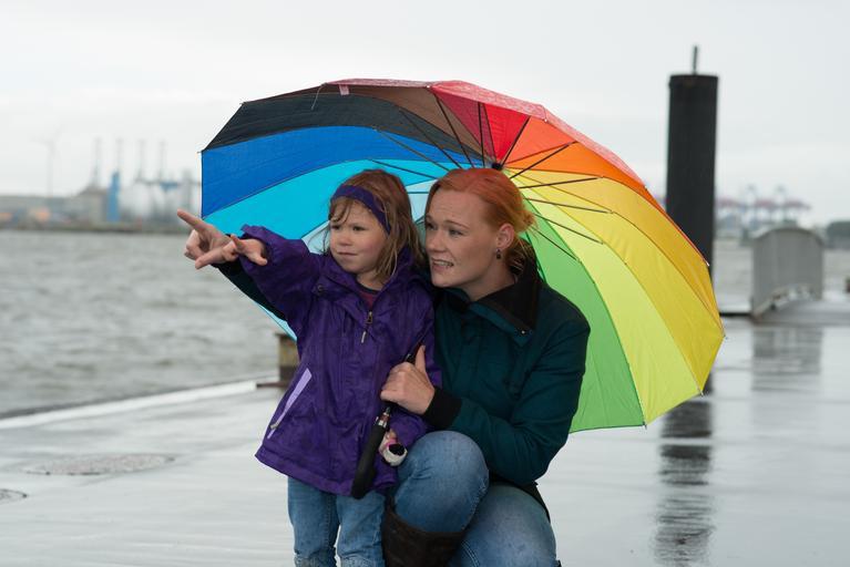 Keywords: woman child umbrella hamburg water port color