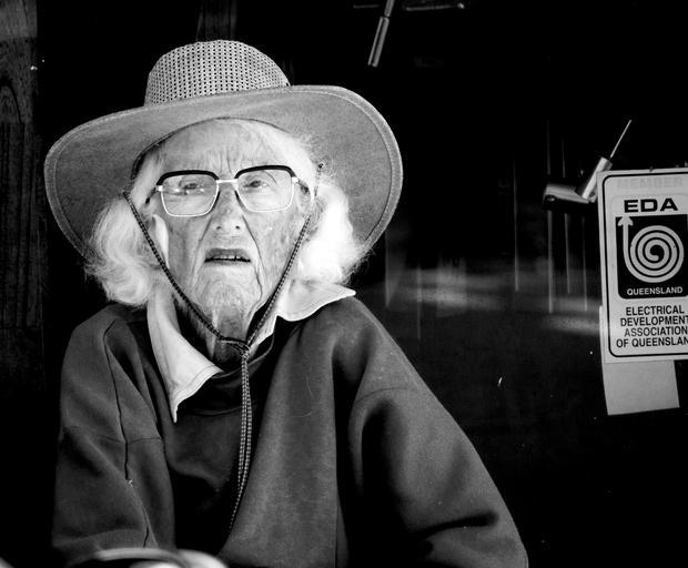 Keywords: woman elderly pensioner female retired senior elder aged sitting street grey white gray old