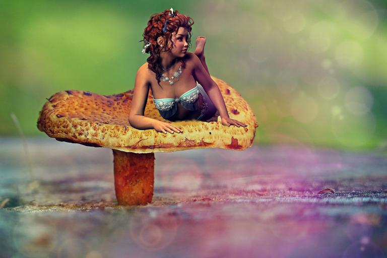 Keywords: woman elf fee fairytale fantasy pose fig conjure girl forest mushroom mystical fairy tales atmosphere mood romantic