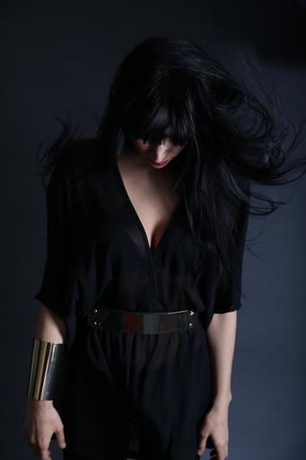 Keywords: woman girl person figure dark black head down female young model portrait hair fashion brunette wind cuff metal