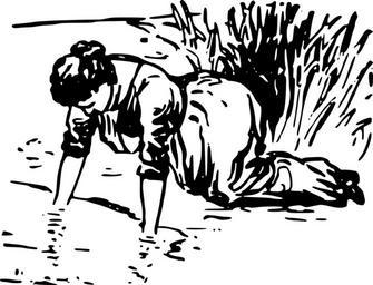 Keywords: woman stream water plants grass black and white lady bending down ground floor taking water river washing hands female rural area