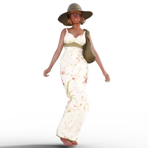 Keywords: woman summer dress hat girl bag flowers naked feet self-conscious beach human