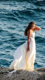 Keywords: woman sunset sea rock sun summer romantic cliff dress white model girl