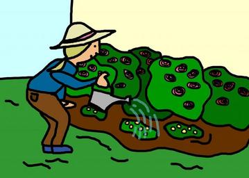 Keywords: woman watering garden spring summer flowers roses cartoon hobby lawn landscape