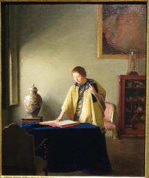 | Keywords: Woman with Book by William McGregor Paxton, c. 1910, oil on canvas on board - New Britain Museum of American Art - DSC09470.JPG en Exhibit in the New Britain Museum of American Art New Britain Connecticut USA This artwork is in the public domain because the artist died more than 70 years ago The museum permitted photographs of this exhibit without restriction 2013-06-27 12 44 23 own Daderot PD-old-70-1923 cc-zero Paintings in the New Britain Museum of American Art Uploaded with UploadWizard William McGregor Paxton Paintings of standing women reading indoors Exotic decorative artefacts in paintings |
