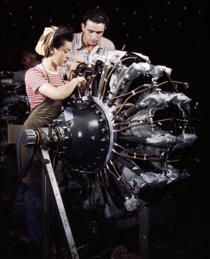 | Keywords: Woman working on R-1830 engine at Douglas Aircraft 1942.jpg A women is trained as an engine mechanic at the Douglas Aircraft Company Long Beach California USA in October 1942 The engine is a Pratt Whitney R-1830 Twin Wasp 14-cylinder radial engine for a Douglas C-47 Skytrain transport plane LOC-image fsac 1a35329 1942-12 Alfred T Palmer frame removed PD-USGov Women at work in the United States Pratt Whitney R-1830 World War II color photographs of the US Homefront Photographs by Alfred T Palmer |