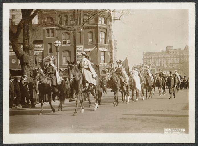 Keywords: Women on horseback in suffrage parade 160077v.jpg Photograph of a contingent of suffragists on horseback on the street in suffrage parade in Washington D C Male spectators on sidewalk left and policeman in uniform on foot escorting equestrians in street right Title derived by Library of Congress staff 1 photograph print 5 x 7 in accession number Call Number Location National Woman's Party Records Group I Container I 160 Folder Suffrage Parade May 9 1914 Source Collection Records of the National Woman's Party institution Library of Congress Manuscript Division http //hdl loc gov/loc mss/mnwp 160077 PD-Harris-Ewing Suffragettes Demonstrations and protests in Washington D C May 1914 in Washington D C |