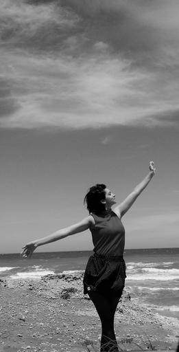 Keywords: women sky harmony peace sea beach black and white open you raise your hand joy happiness
