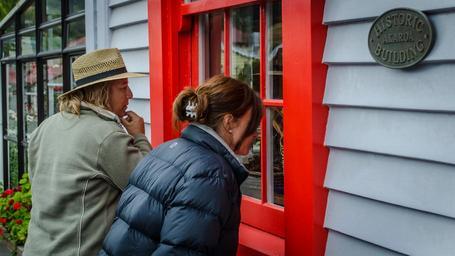 Keywords: women stained glass window looking at shopping